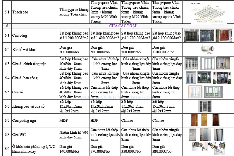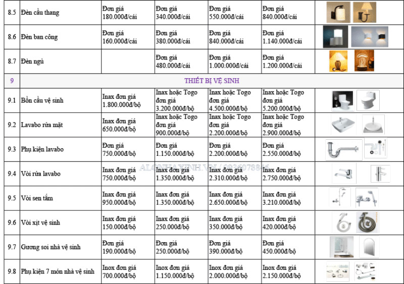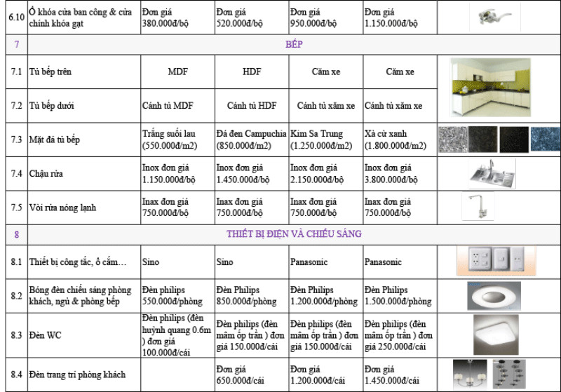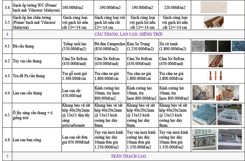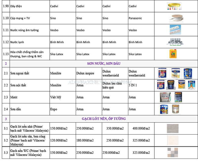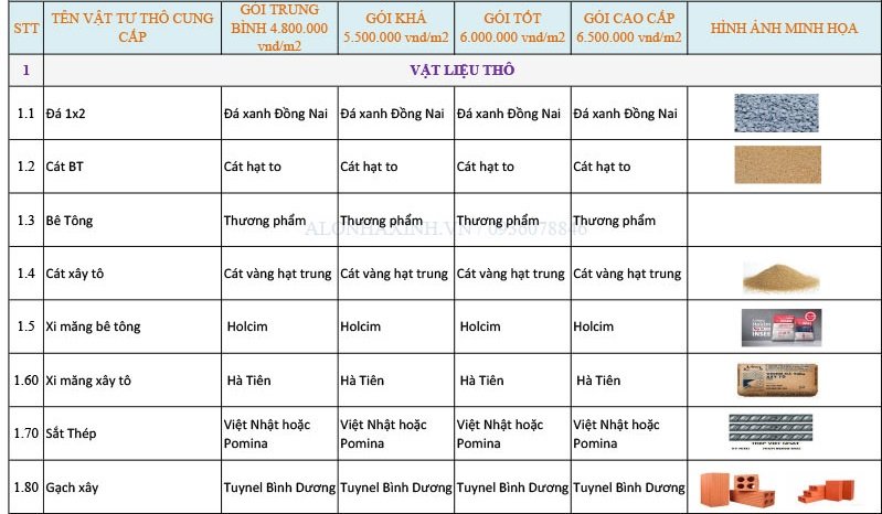 Để bạn dễ hình dung, XÂY DỰNG SẮC VIỆT HOUSE xin gửi đến bạn bảng thống kê chủng loại vật tư thô, hoàn thiện và mẫu dự toán chi tiết không phát sinh như sau:
