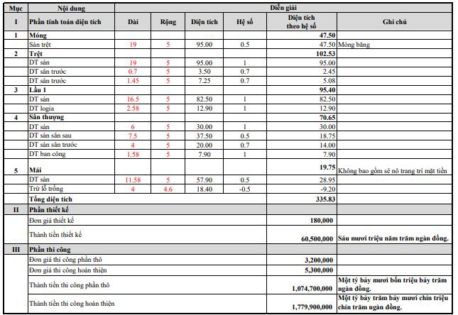 Lưu ý: Đơn giá trên chưa bao gồm chi phí khoan cọc nhồi, khoan địa chất, ép cọc, tháo dỡ nhà cũ. Vật liệu có thể thay đổi theo từng địa phương có cùng giá trị chất lượng như nhau nếu khó khăn trong phần vật tư cung ứng cho công trình.