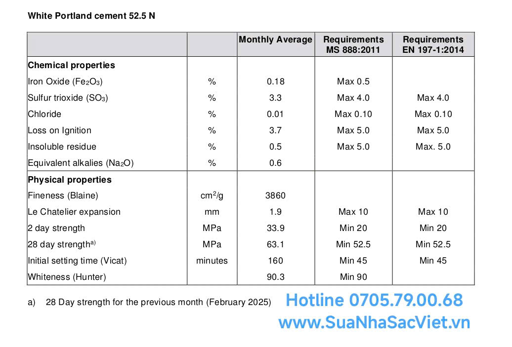Thông số kỹ thuật Xi măng trắng AALBORG 52.5