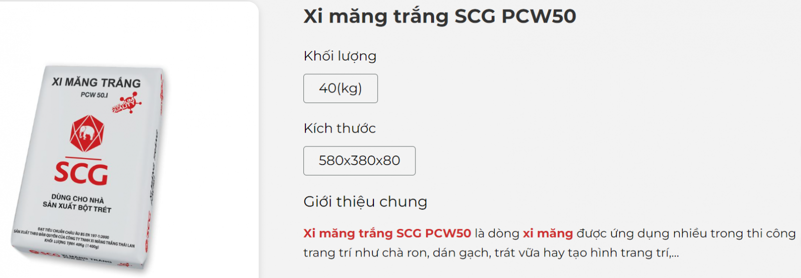 Xi măng trắng SCG Thái Lan PCW50 thường được dùng cho các công trình có độ bền chắc, có thể được sử dụng làm bột trét, giúp tăng tính thẩm mỹ cho công trình. Ngoài ra, xi măng trắng con voi SCG còn được sử dụng để sản xuất các vật liệu trang trí đúc sẵn và các công trình kết cấu.