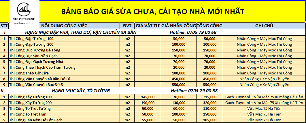 BẢNG GIÁ SỬA CHỮA NHÀ MỚI NHẤT 2022   www.suanhasacviet.vn